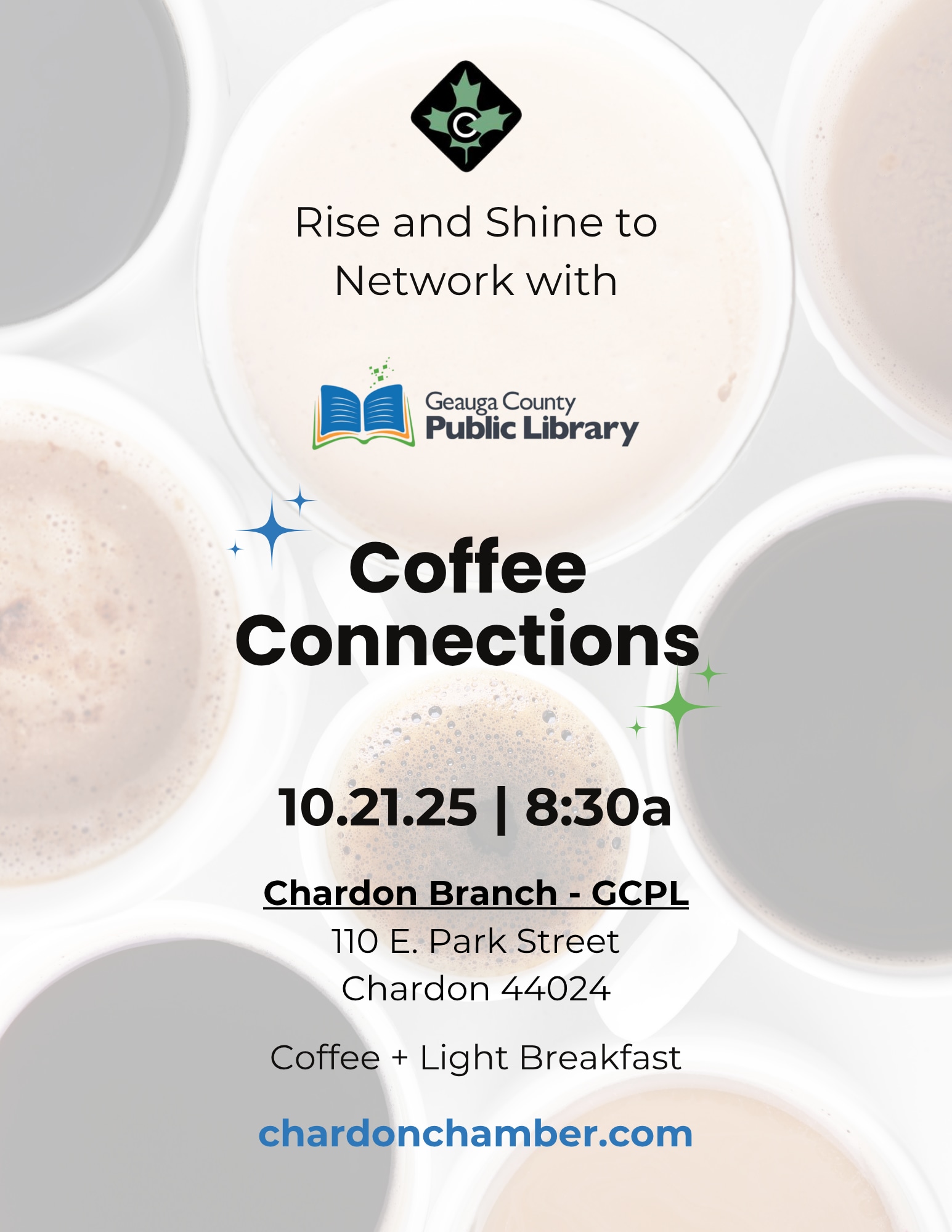 Start your week with great conversations and fresh connections at our October Coffee Connections, hosted by the Geauga County Public Library - Chardon Branch on Monday, October 21st.